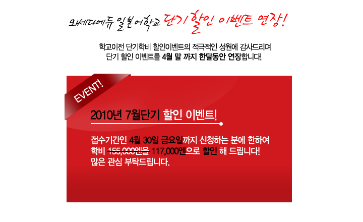 2010³â 1¿ù, 4¿ùÇбâ Çб³ÀÌÀü ´Ü±âÇкñ ÇÒÀÎ À̺¥Æ®¸¦ ½Ç½ÃÇÑ °á°ú ¿©·¯ºÐµéÀÇ Àû±ØÀûÀÎ ¼º¿øÀ¸·Î Çб³¿¡¼ ´Ü±â ÇÒÀÎ À̺¥Æ®¸¦ 4¿ù ¸» ±îÁö ÇÑ´Þ ´õ ¿¬Àå ÇÕ´Ï´Ù.