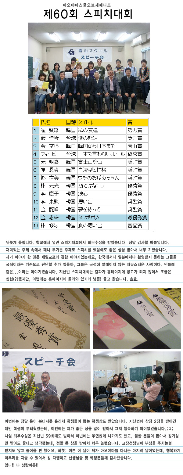 À¯Çлý üÇè´ã - ¾îÇп¬¼ö, Àü¹®Çб³, ´ëÇÐ(¿ø), ±â¼÷»ç, ÀϺ»»ýȰ > ½ºÇÇÄ¡´ëȸ¿¡¼ ÃÖ¿ì¼ö»óÀ» ¹Þ¾Ò½À´Ï´Ù :-)